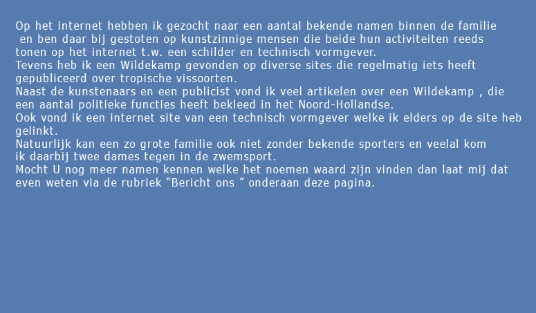Startpagina Stamboom De Historie Oude foto''s Het laatste nieuws Bekende Wildekampie's Overige zaken Aanvullingen doorgeven Mail ons even